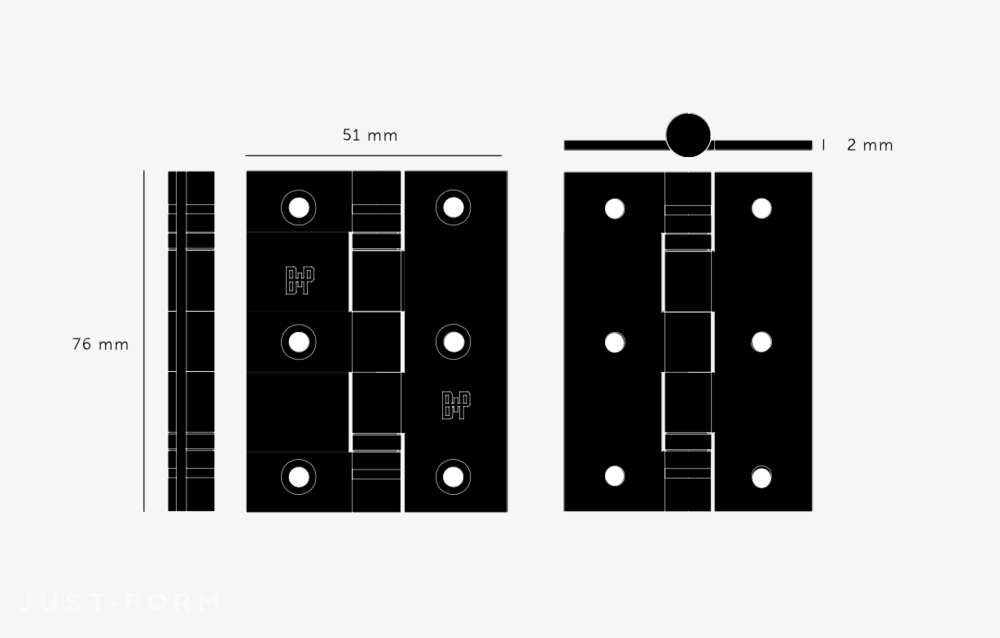 Дверные петли Door Hinge / Set of 2 / 76 x 51 x 2 mm от британской фабрики Buster + Punch. Эти петли выполнены из цельной нержавеющей стали и отличаются лаконичным дизайном и прочной конструкцией. Каждая петля имеет специальные отверстия под винты с потайной головкой и украшена выгравированным логотипом B+P. Петли продаются парами и идеально подходят для создания единого, стилистически согласованного образа с любой дверной фурнитурой Buster + Punch (ручками, накладками, дверными стопперами). Доступны версии из не окрашенной нержавеющей стали, с PVD покрытием под латунь и катафорезным черным матовым покрытием. Образцы изделий, материалов и отделок Buster + Punch представлены в нашем шоуруме.